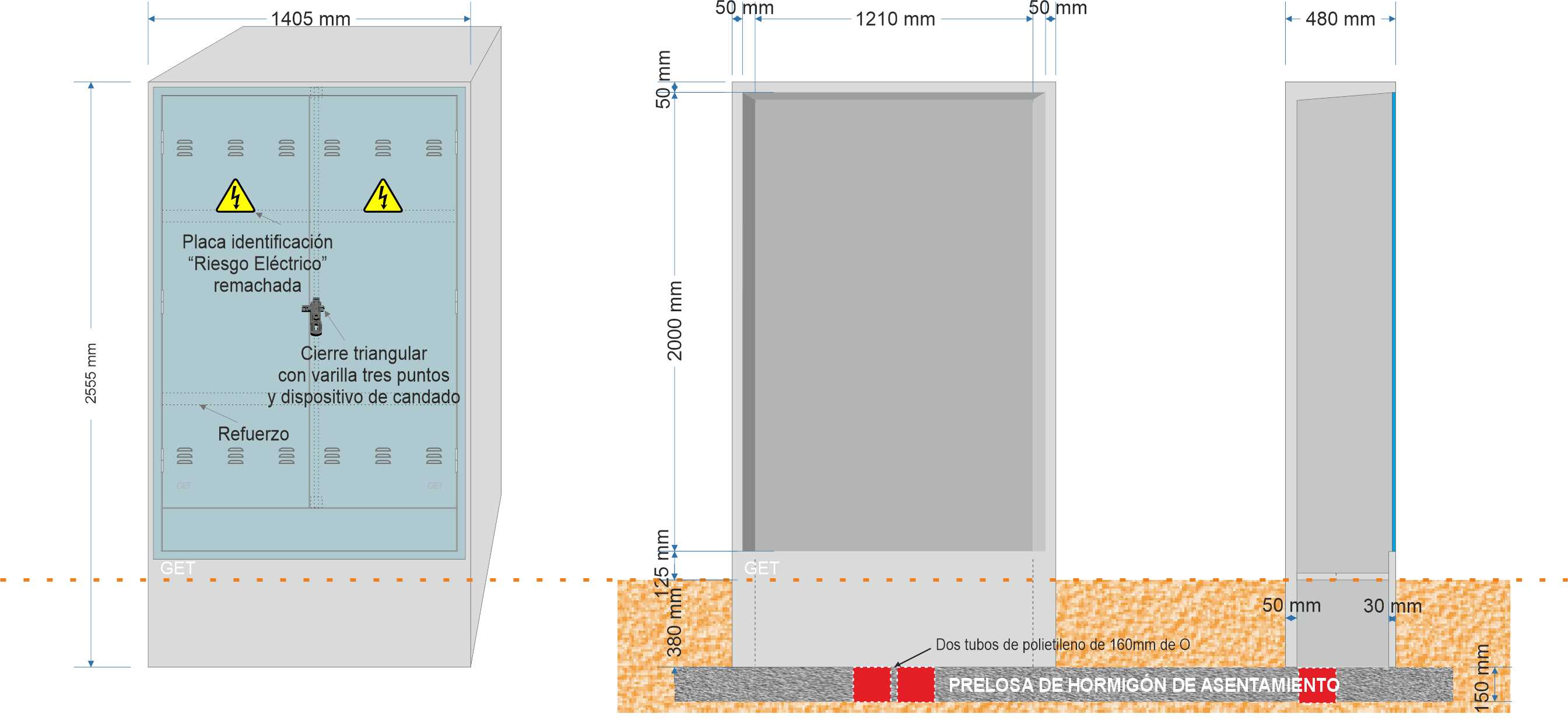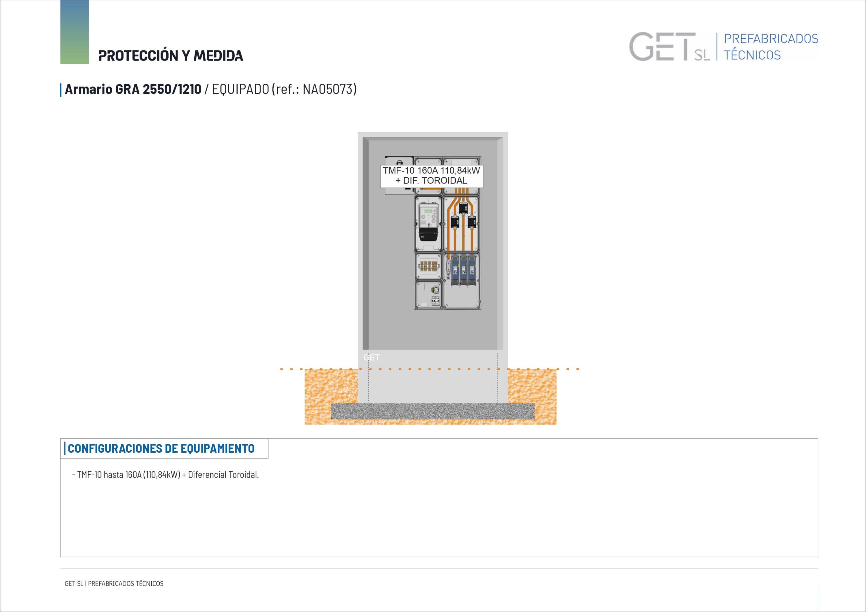 Armario prefabricado monobloque con puerta metálica, con capacidad para albergar un TMF10 de hasta 110,84 Kw + Diferencial Toroidal. Se puede suministrar totalmente EQUIPADO.