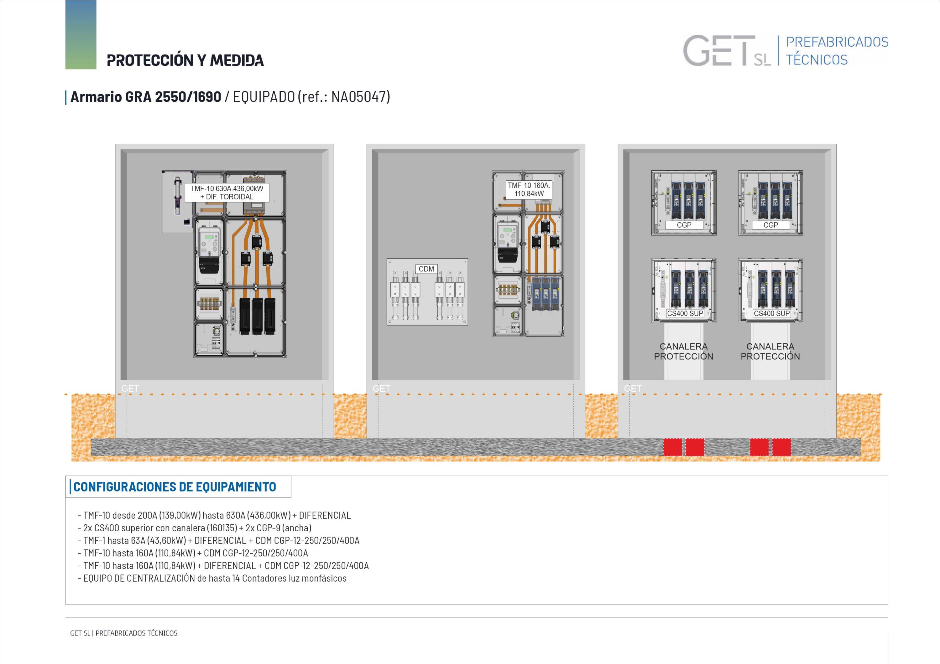 Descripción: Armario prefabricado monobloque con puertas metálicas, con capacidad para albergar en su interior una TMF-10 de hasta 436 Kw., más caja con toroidal lateral u otros equipos de acuerdo con las especificaciones de FECSA ENDESA. Se puede suministrar totalmente EQUIPADO.
