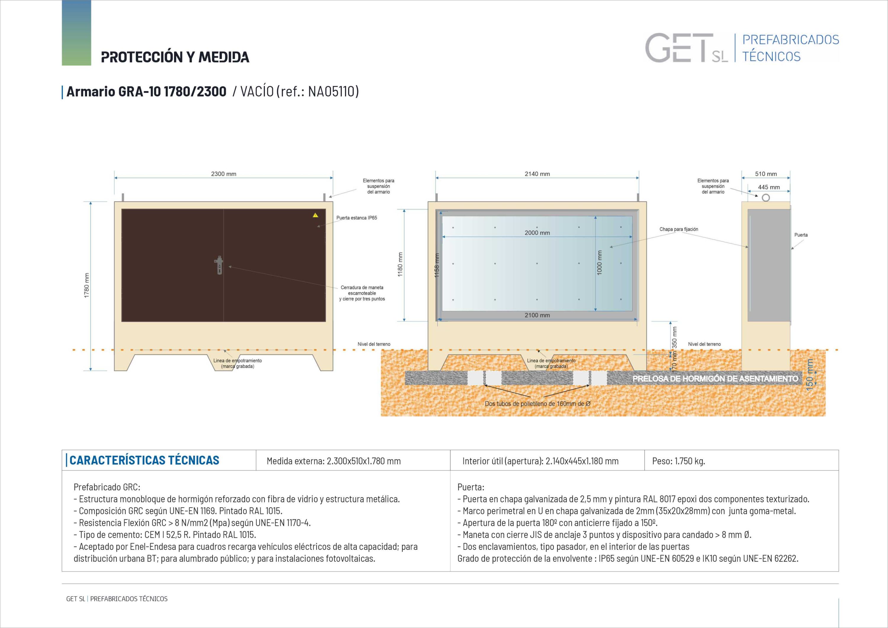 ARMARIO ESPECIAL GRA-10-1780/2300, Construido en hormigón con estructura metálica para ubicación de elementos de protección, mando y control de las líneas de salida en cargadores de alta capacidad (de hasta 6 unidades) cuando la medida se realiza en media tensión dentro del recinto de transformación.