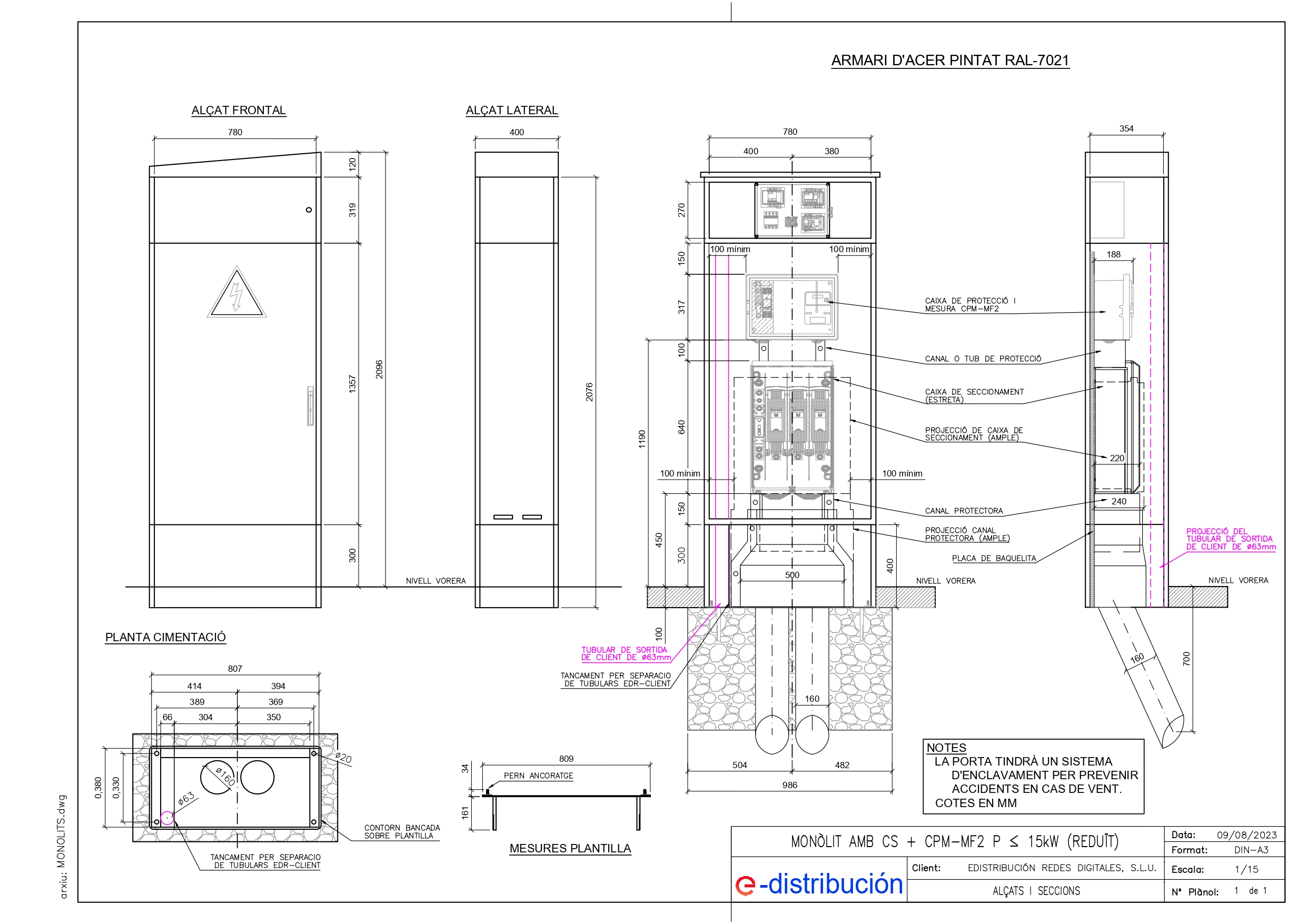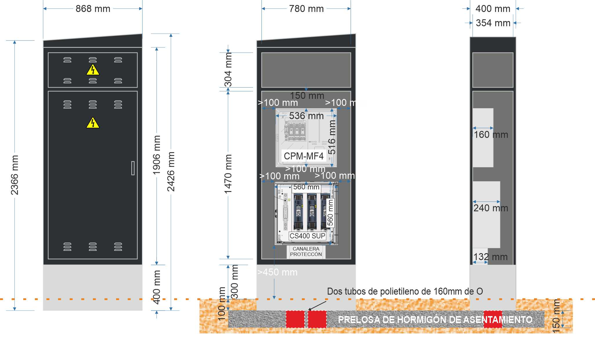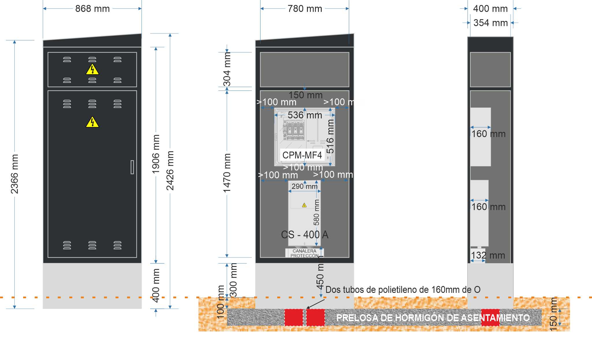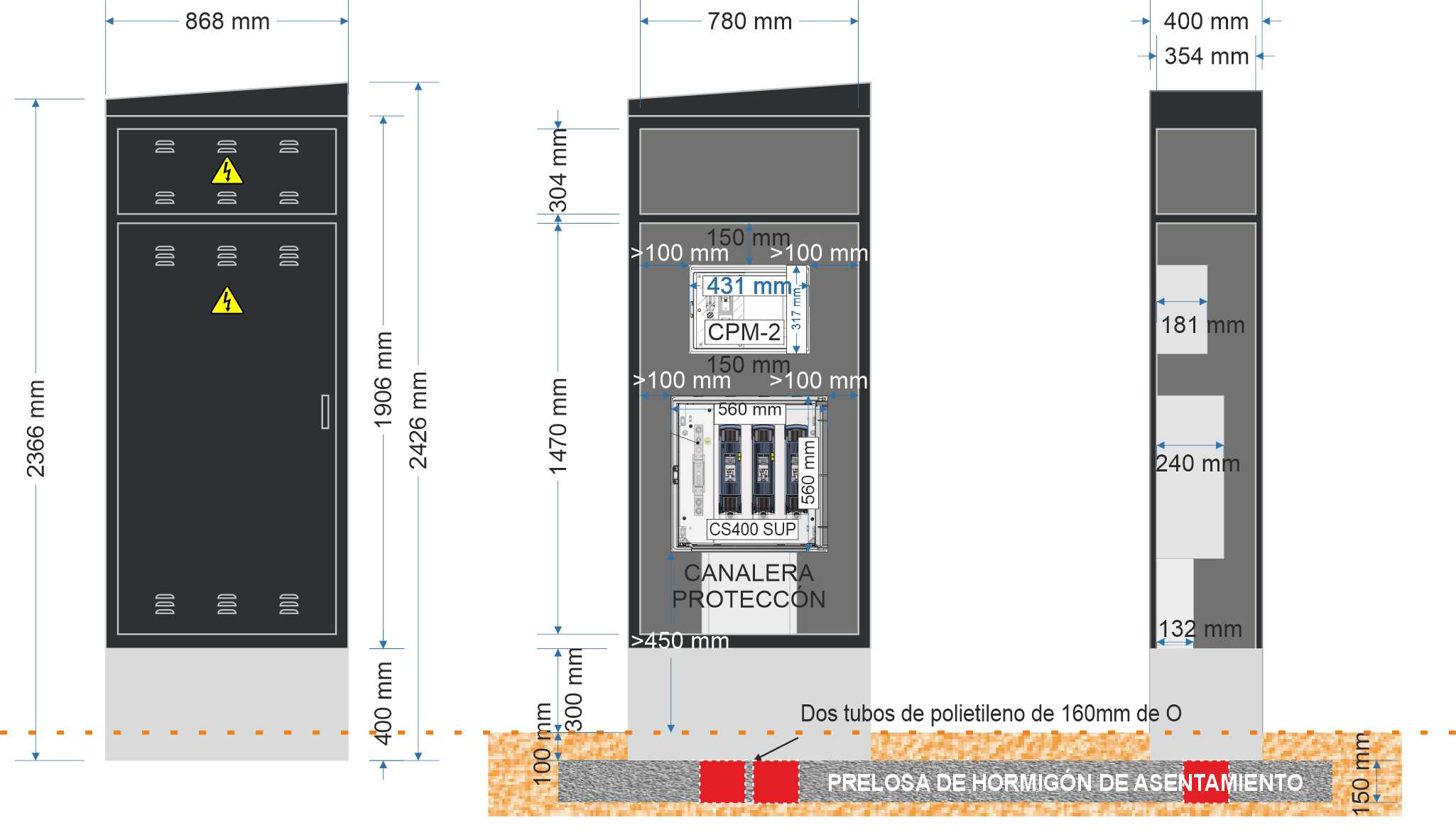 Armario metálico inox con puerta metálica con capacidad para albergar una Caja de Seccionamiento (CS400) más una Caja de Protección y Medida directa (CPM), monofásica o trifásica. Altillo con puerta para albergar Cuadro de Control y Mando.