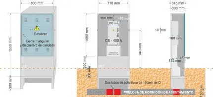 Armario prefabricado monobloque más peana, con puerta metálica con capacidad para albergar una Caja de Distribución para urbanizaciones (CDU) o Caja de Seccionamiento con salidas en la parte inferior (CS400) (instalaciones tramitadas con anterioridad al 01/01/2025)