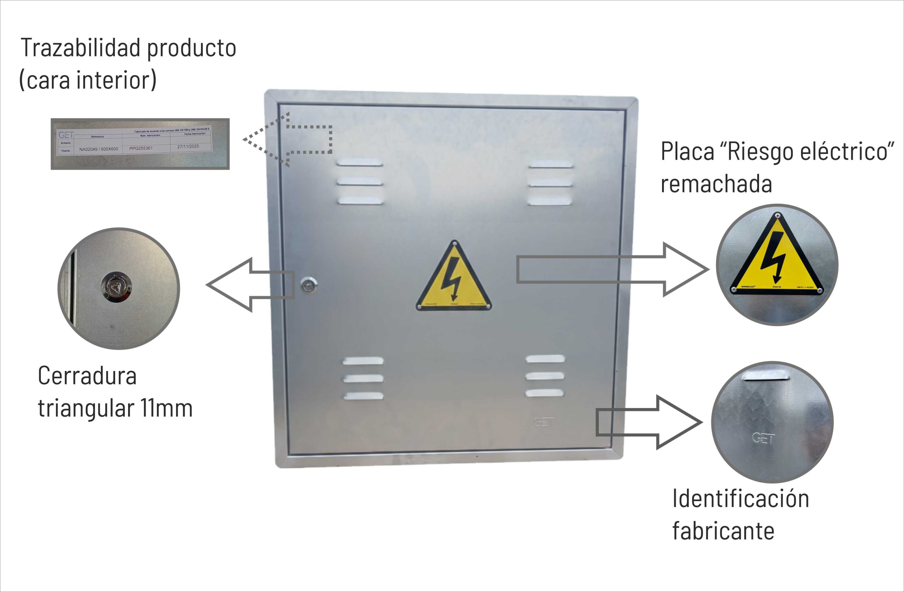 – Símbolo «ADVERTENCIA DE RIESGO ELÉCTRICO» en aluminio anodizado de 0,5mm de espesor mínimo y su base comprendida entre 150 y 200 mm.