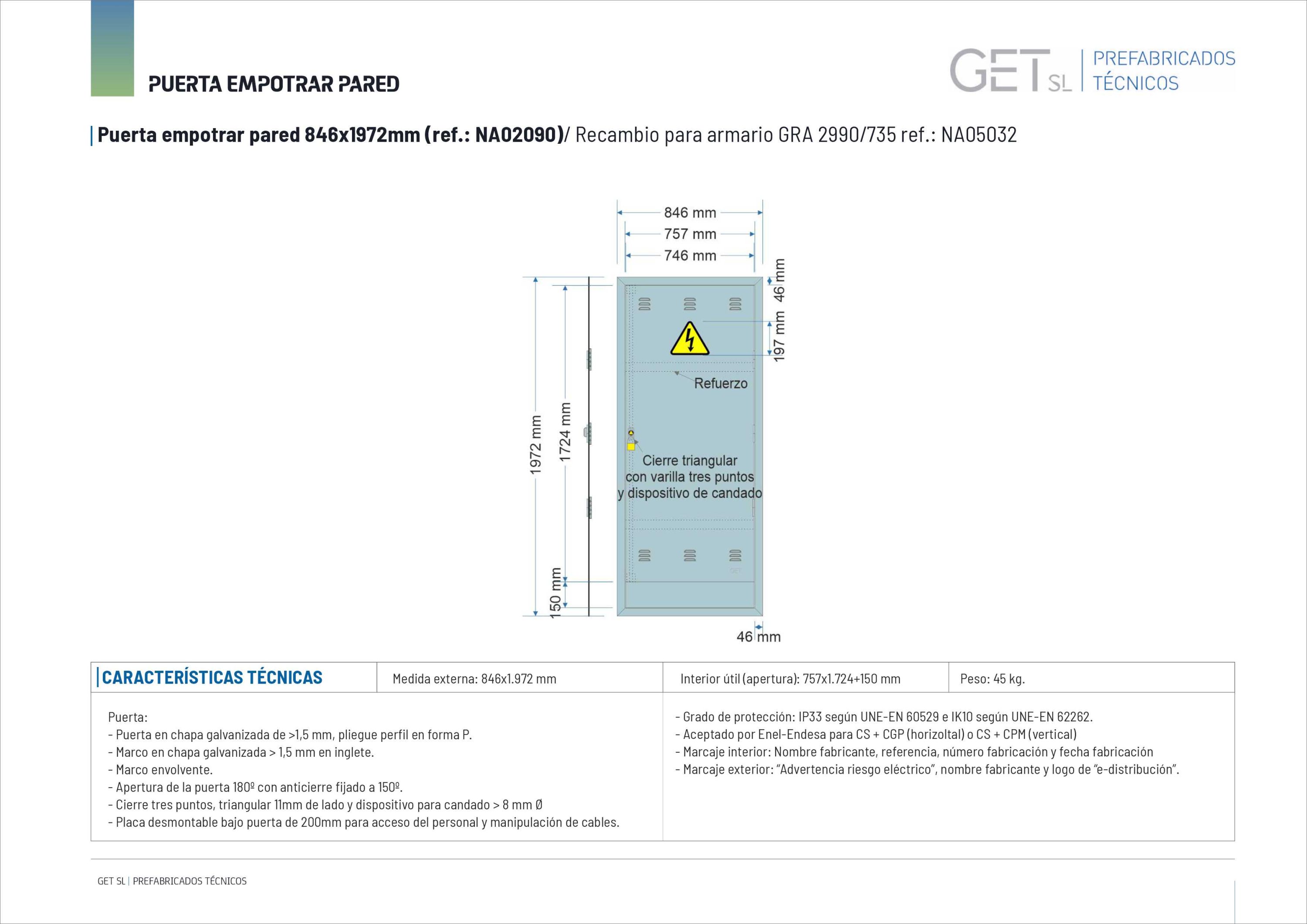NA02090. Puerta empotrar en pared/ nichos FECSA ENDESA para CS400+CGP (Vertical)/ Armario GRA 2990/735. (medida 846x1972mm)