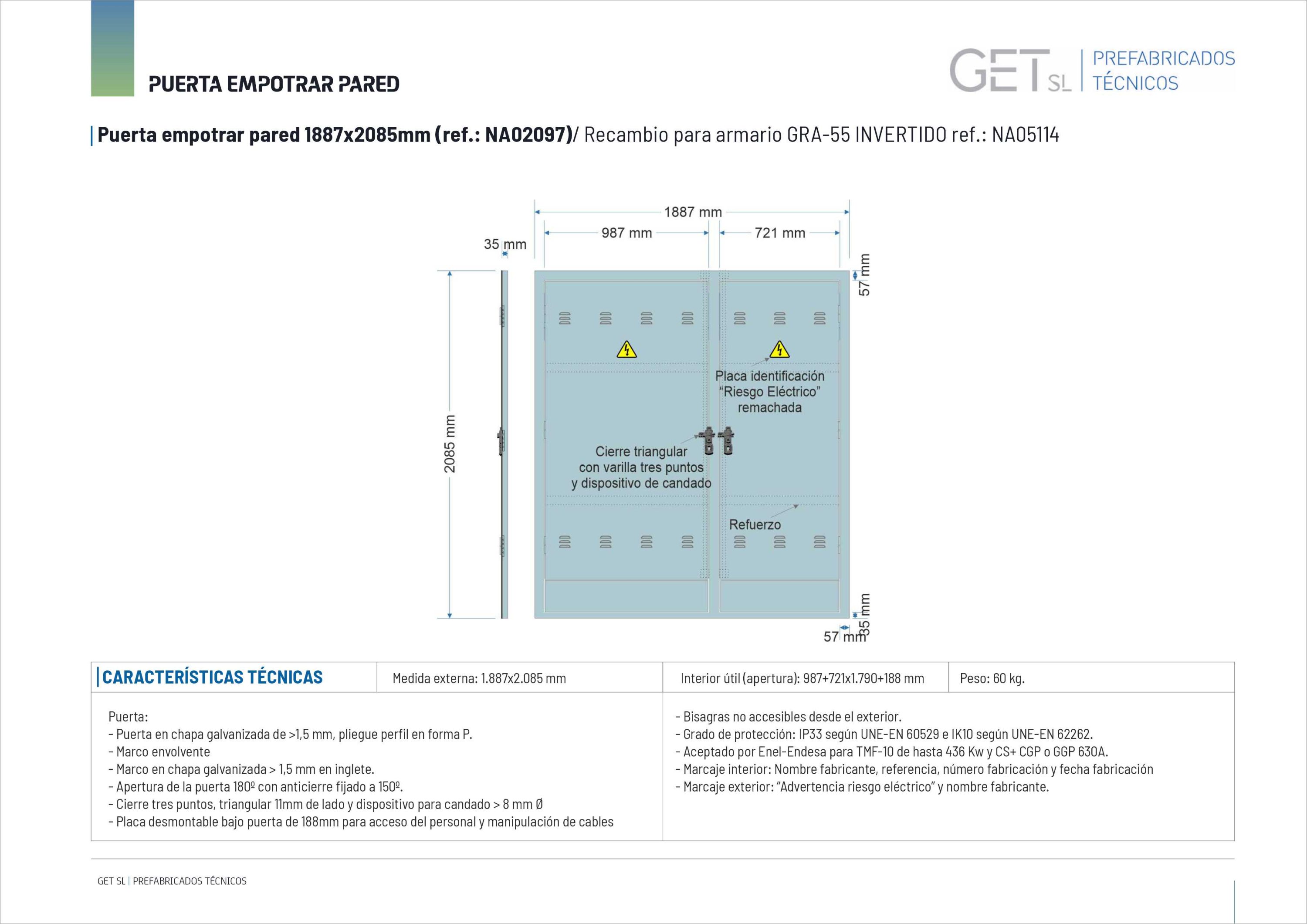 NA02097. Puerta empotrar en pared/ nichos FECSA ENDESA para TMF10 de hasta 436,00Kw +CS + CGP + / Armario GRA-55 INVERTIDO. (medida 1887x2085mm)
