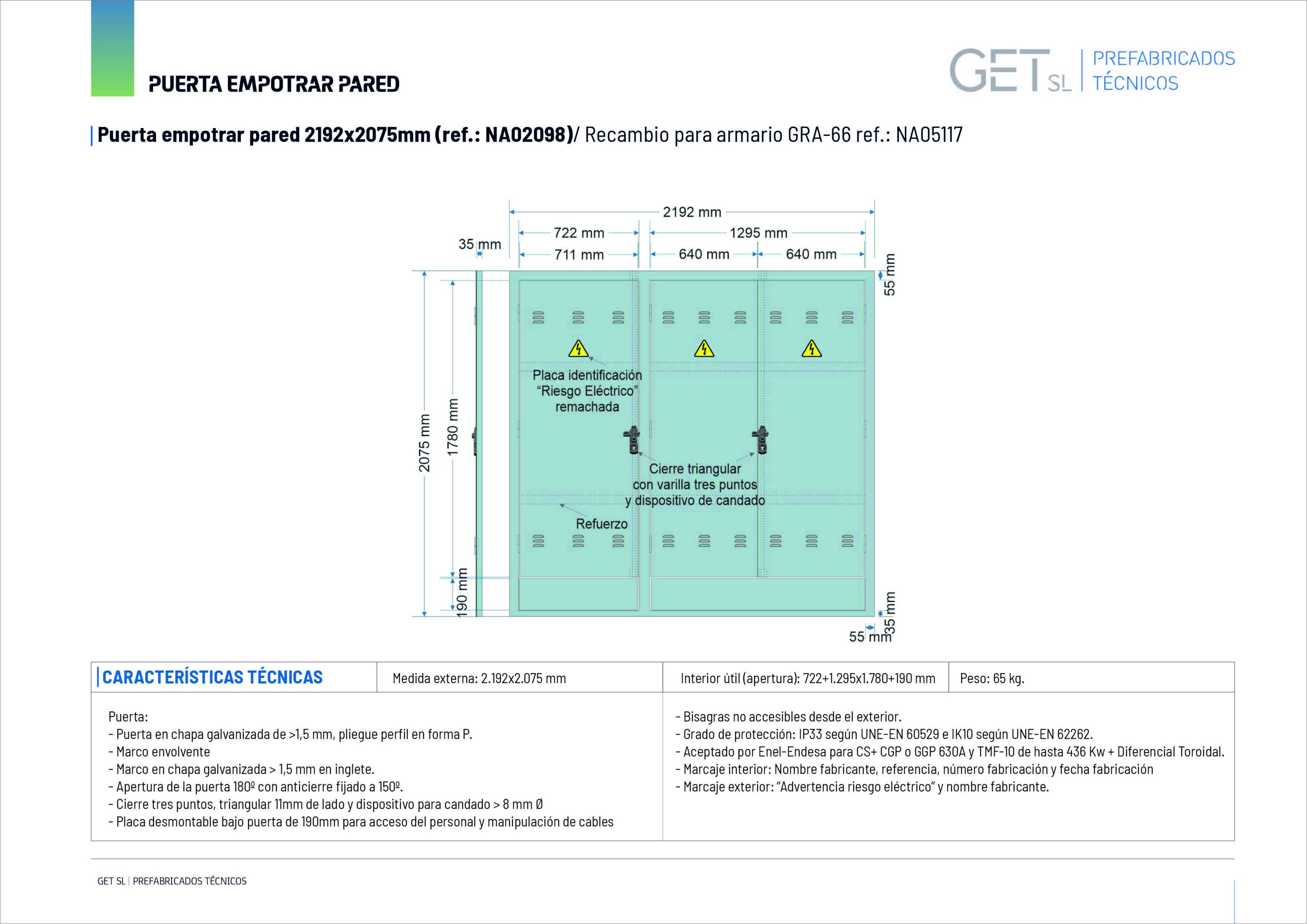 NA02098. Puerta empotrar en pared/ nichos FECSA ENDESA para CS + CGP + TMF10 de hasta 436,00Kw + Diferencial Toroidal / Armario GRA-66. (medida 2192x2075mm)