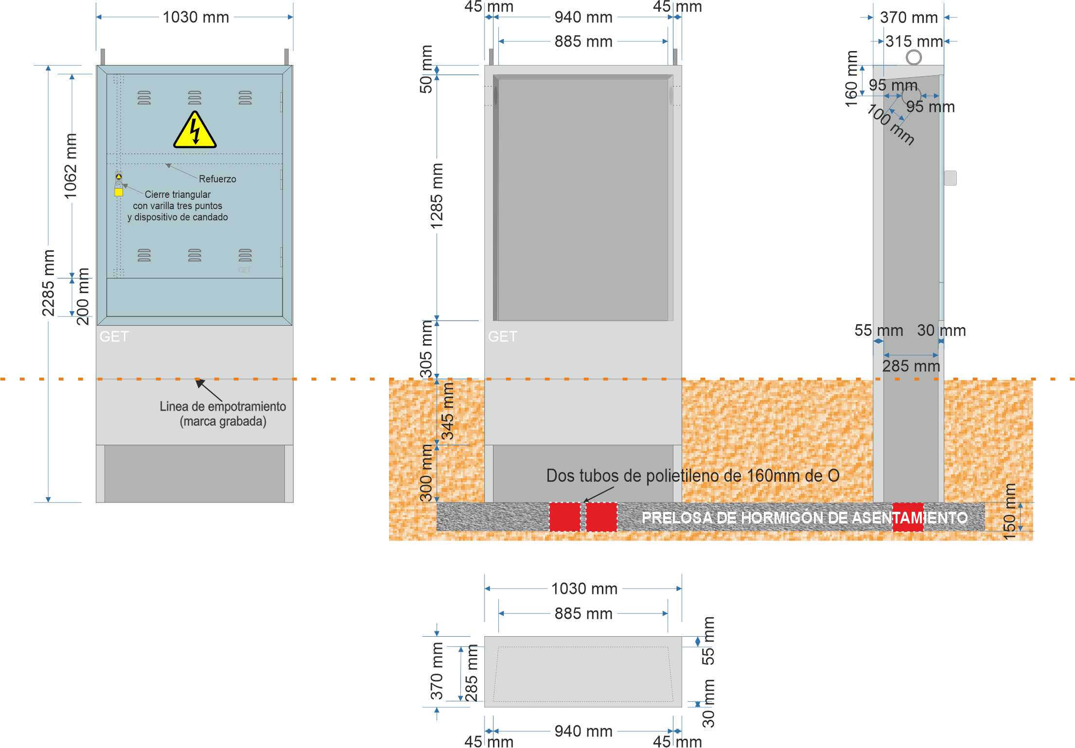 - El cuerpo del armario estará fabricado con hormigón armado con fibra de vidrio (GRC), según las normas generales para el control de producción de material GRC definidas en la norma UNE-EN 1169