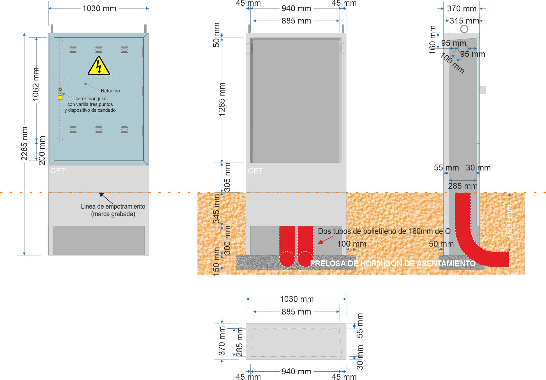 – En la pared frontal incluye grabado de Linea de empotramiento de 50cm y 2mm de profundidad, a nivell del terreno.