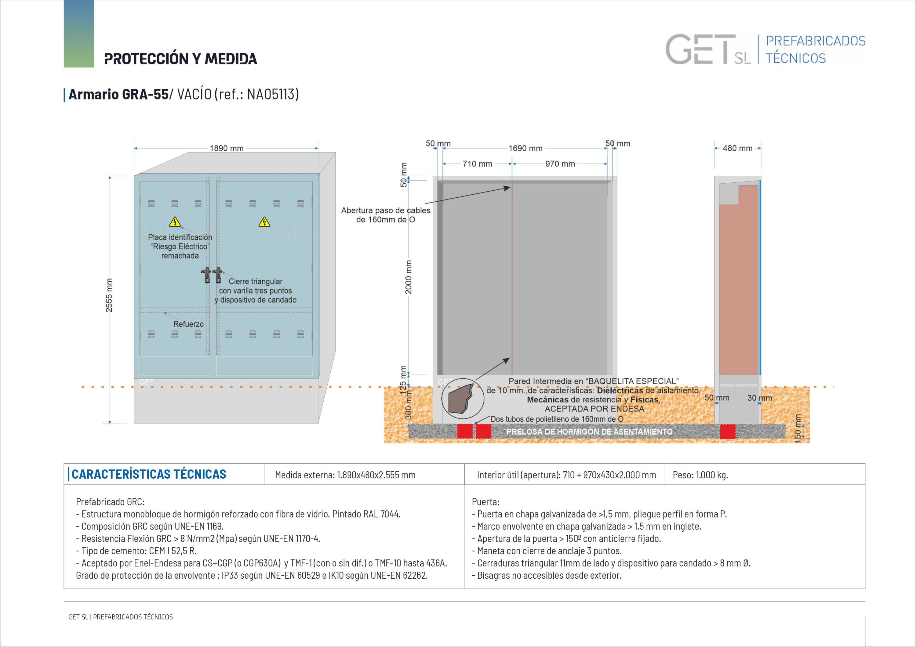 Descripción: Armario prefabricado monobloque de dimensiones 2.555 x 1.890 x 480 mm., Composición GRC según UNE-EN 1169. •Resistencia Flexión GRC 8 N/mm2 (Mpa) según UNE-EN 1170-4. •Tipo de cemento: CEM I 52,5 R., con dos habitáculos independientes y dos puertas totalmente diferenciadas.