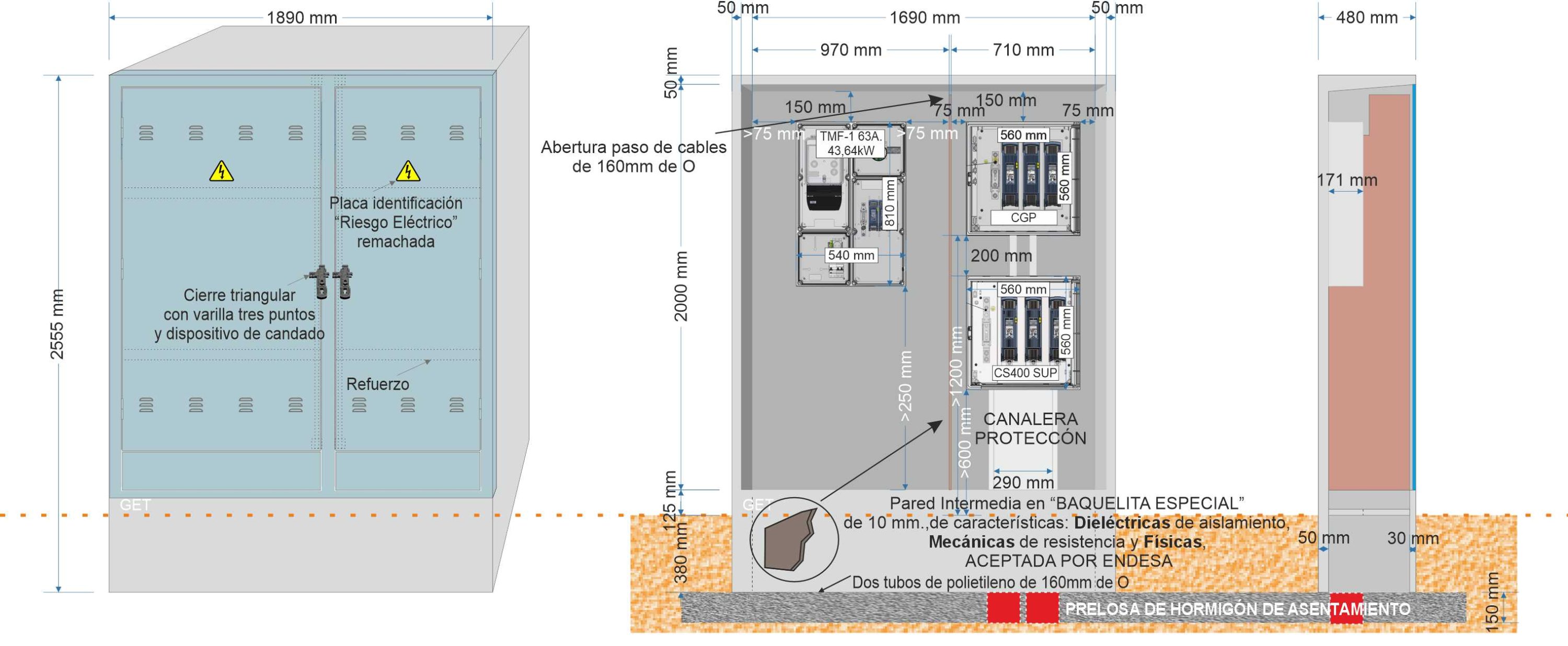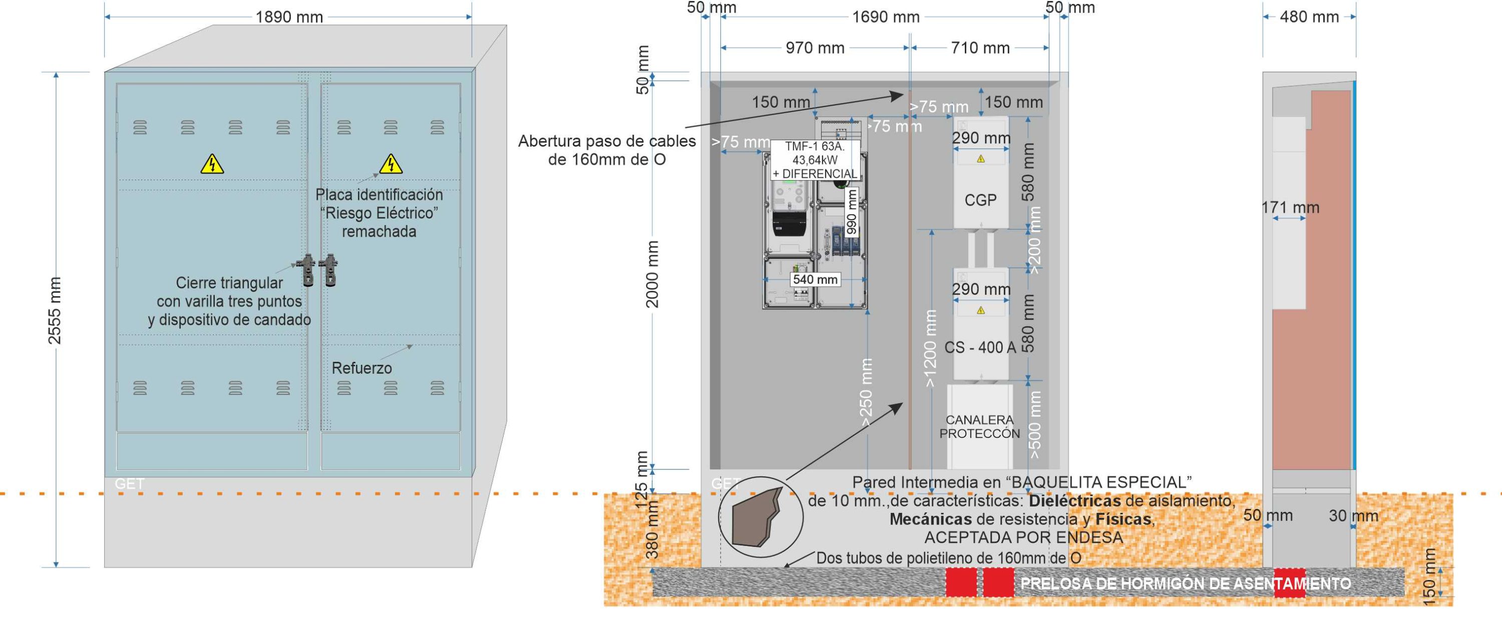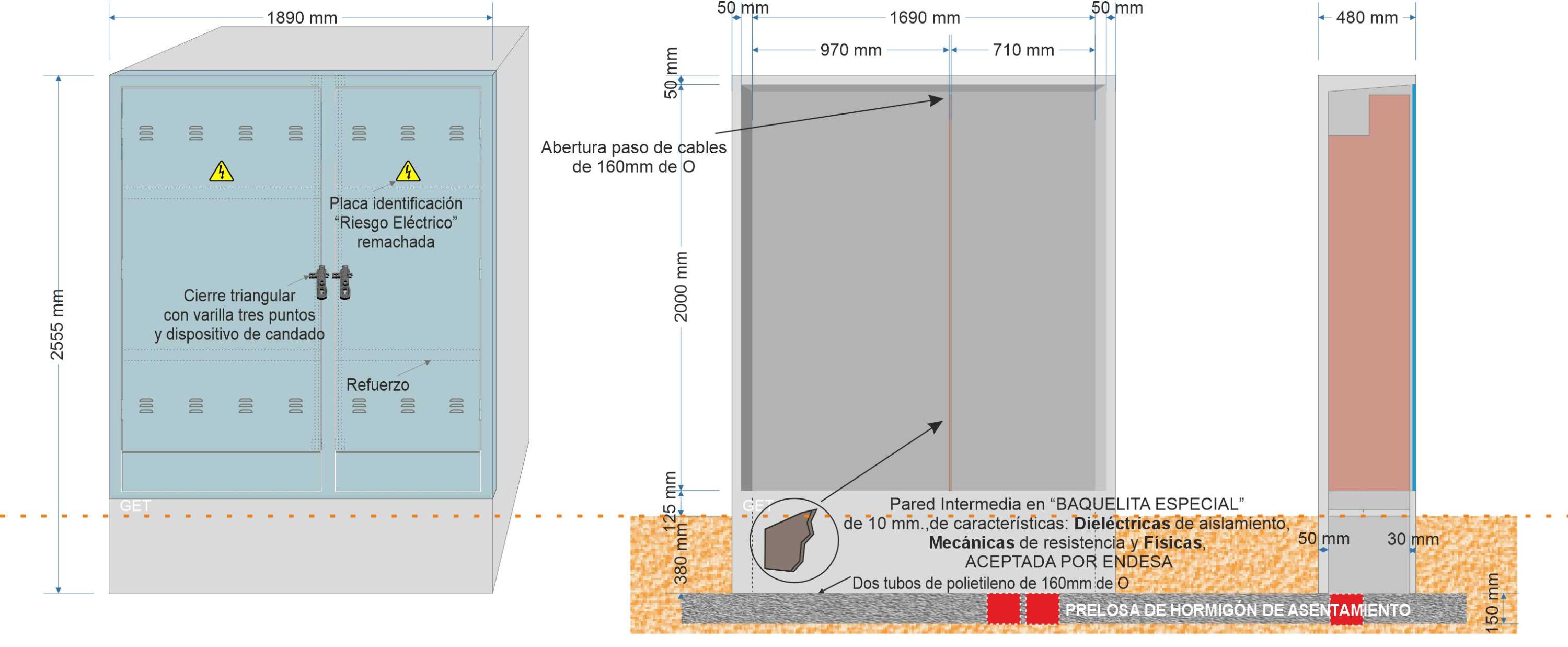Descripción: Armario prefabricado monobloque de dimensiones 2.555 x 1.890 x 480 mm., Composición GRC según UNE-EN 1169. •Resistencia Flexión GRC 8 N/mm2 (Mpa) según UNE-EN 1170-4. •Tipo de cemento: CEM I 52,5 R., con dos habitáculos independientes y dos puertas totalmente diferenciadas.