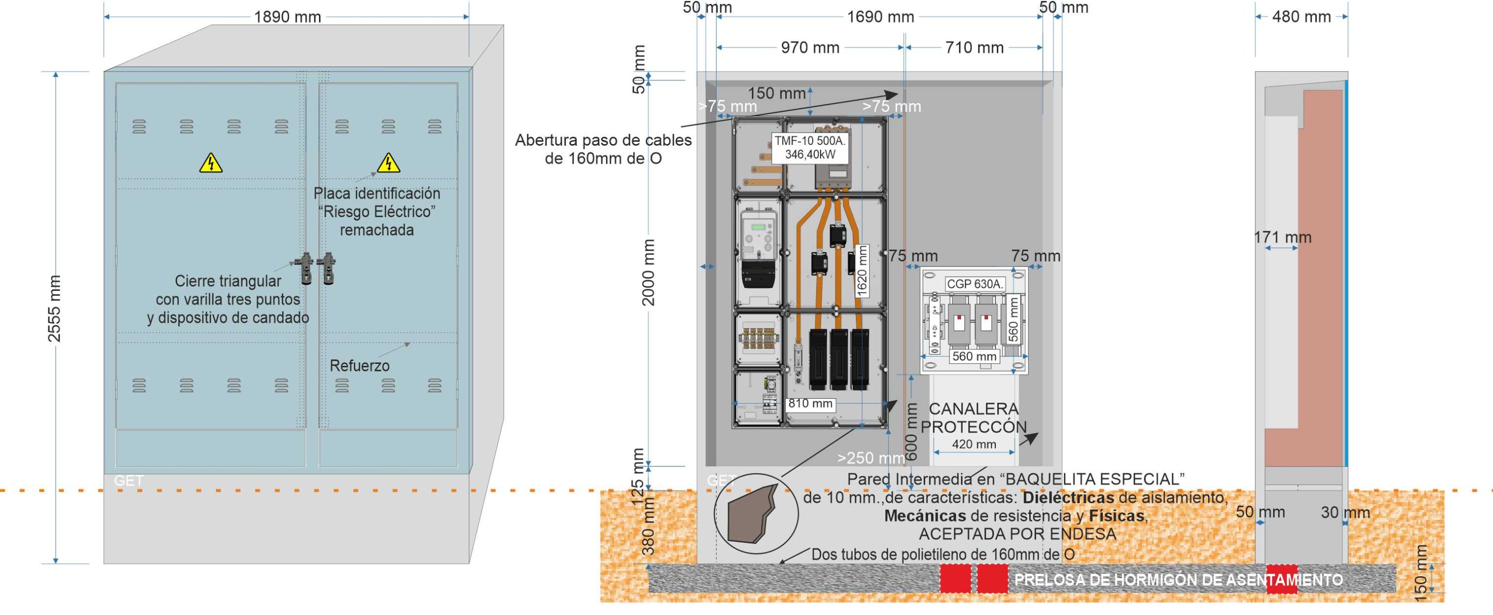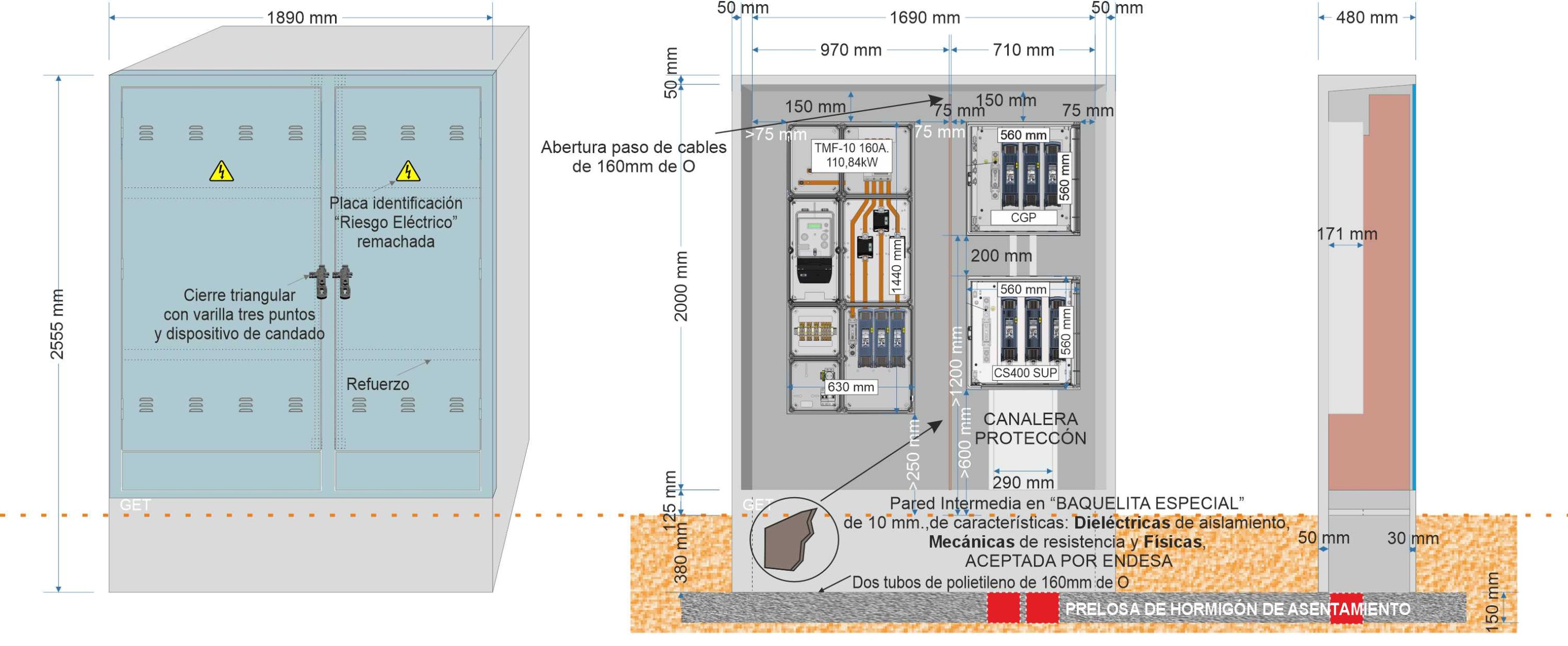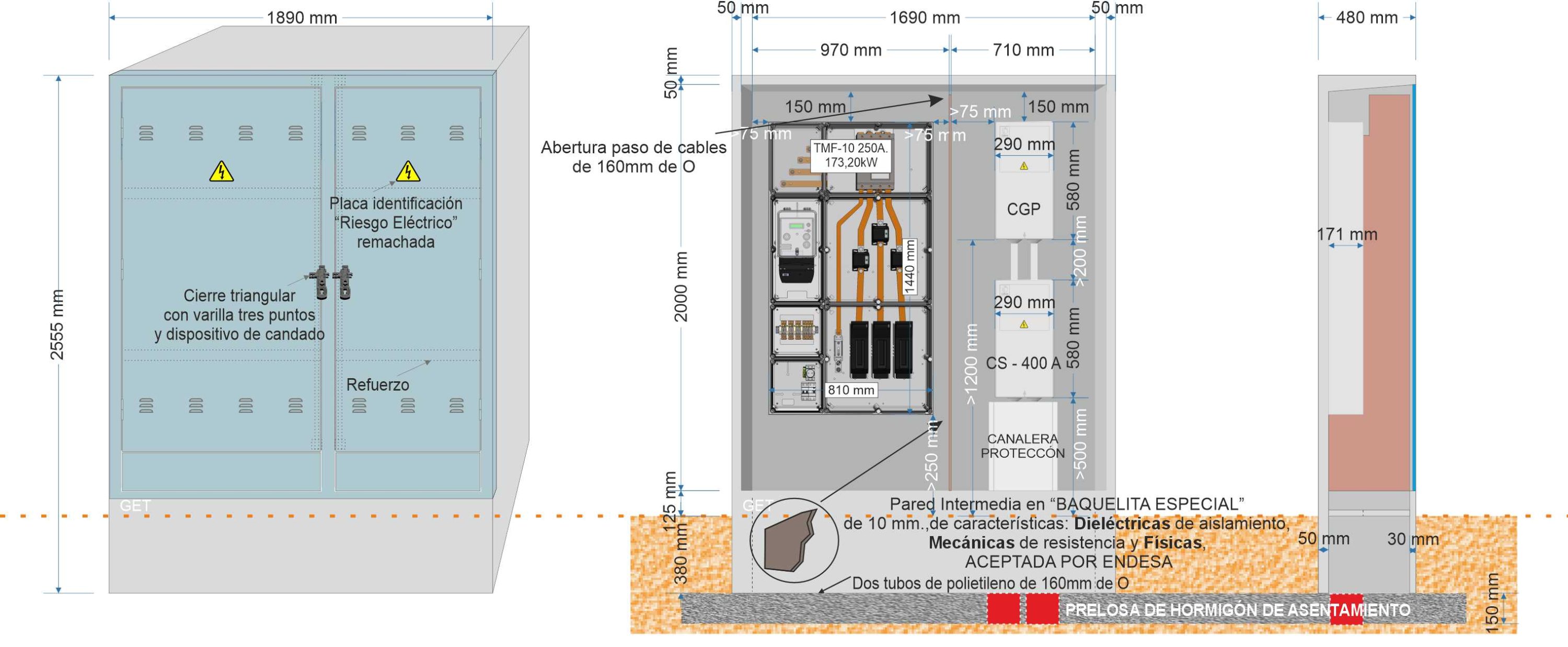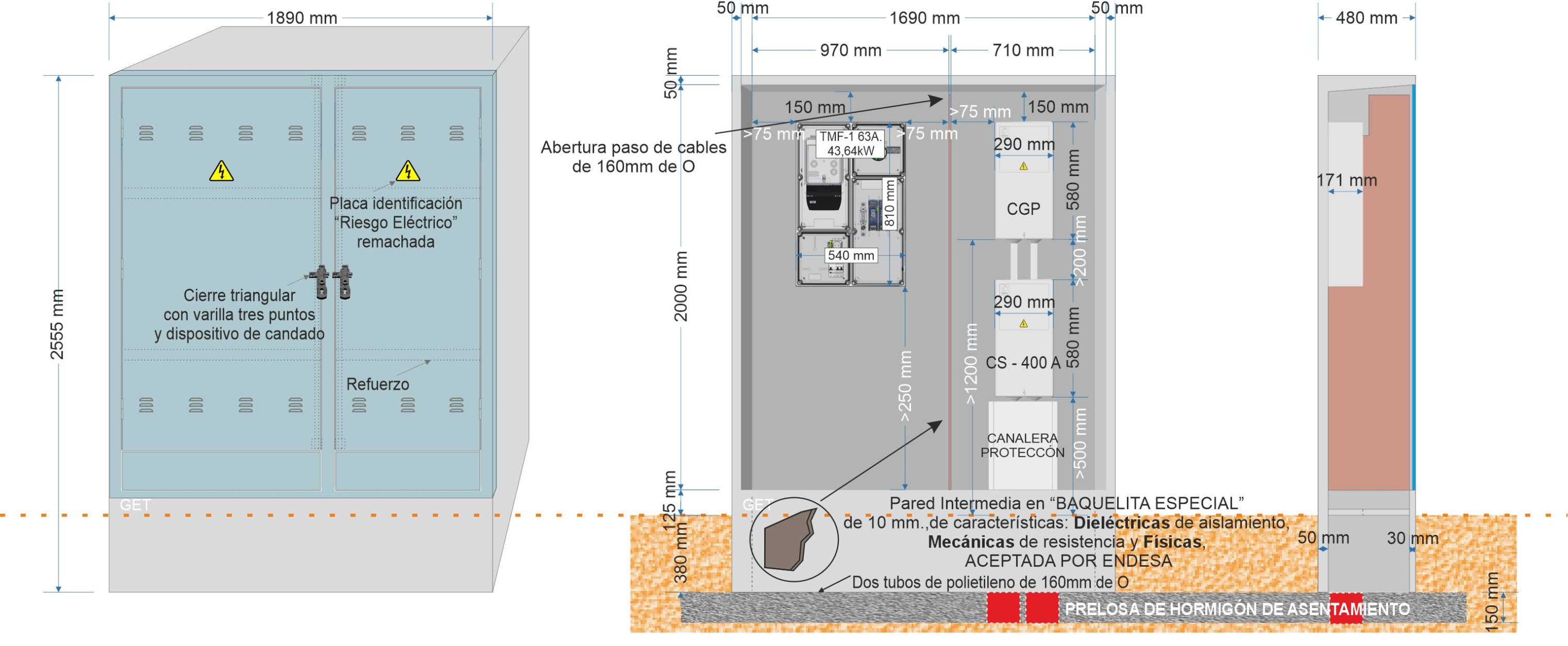 Descripción: Armario prefabricado monobloque de dimensiones 2.555 x 1.890 x 480 mm., Composición GRC según UNE-EN 1169. •Resistencia Flexión GRC 8 N/mm2 (Mpa) según UNE-EN 1170-4. •Tipo de cemento: CEM I 52,5 R., con dos habitáculos independientes y dos puertas totalmente diferenciadas.