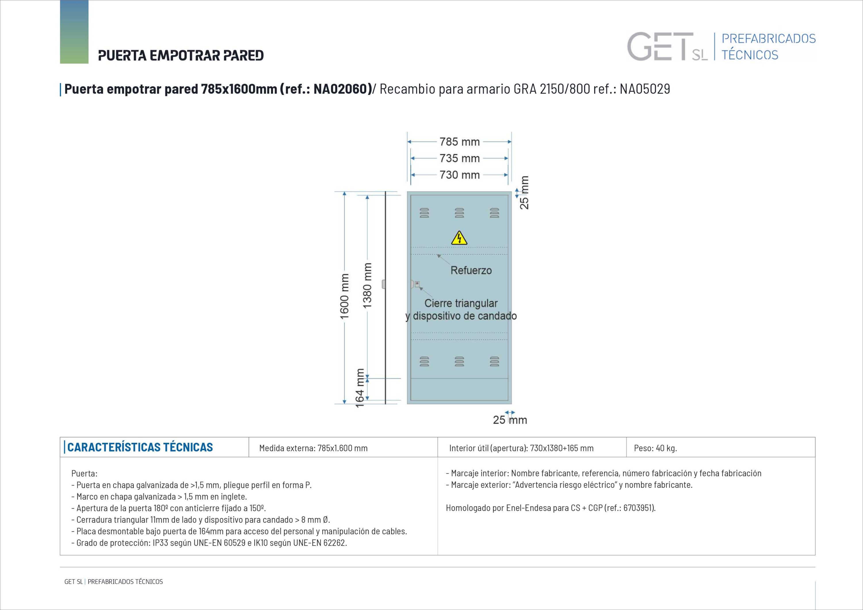 NA02060. Puerta empotrar en pared/ nichos FECSA ENDESA para CS + CGP/ Armario GRA 2150/800. (medida 785x1600mm)